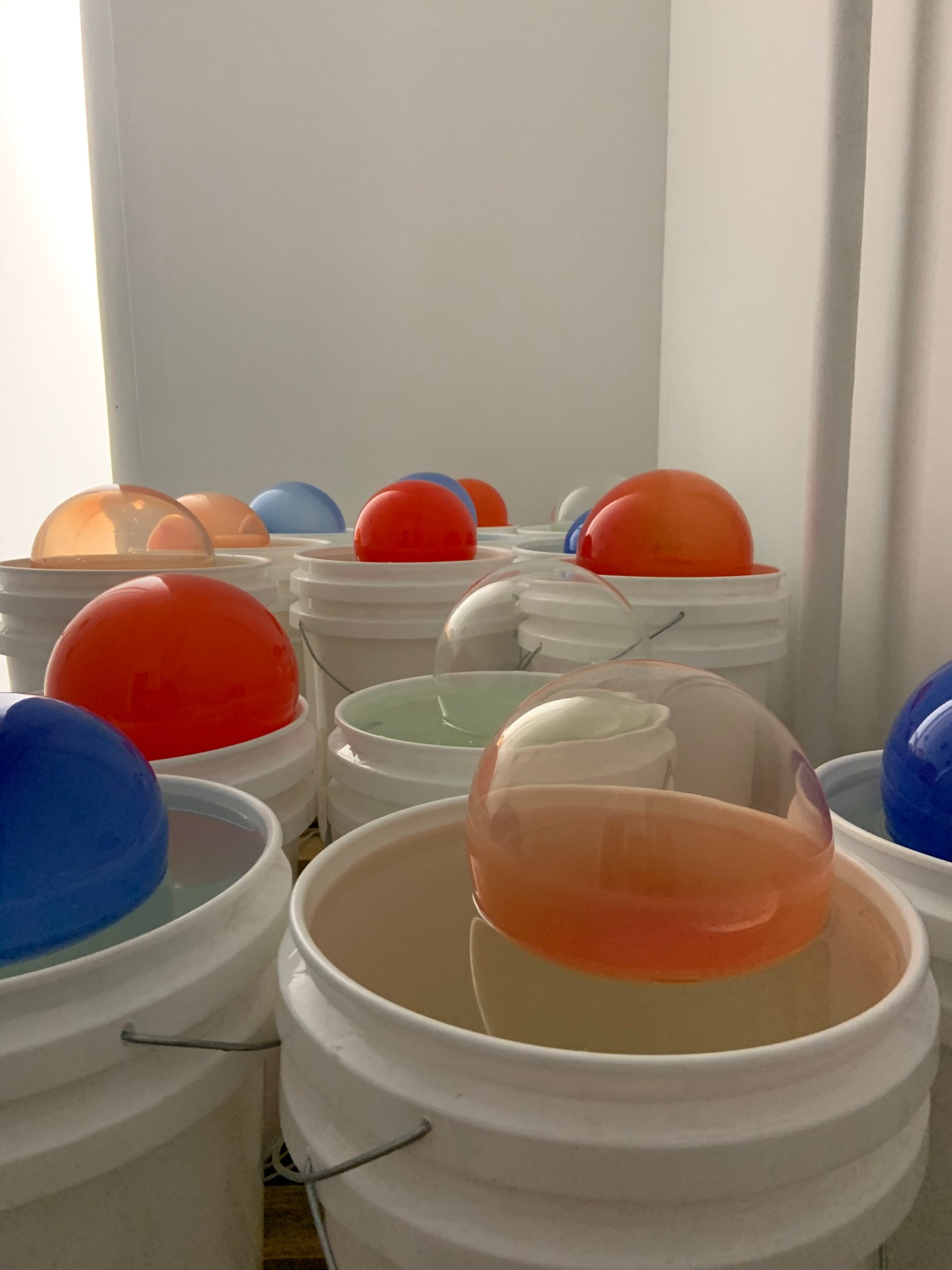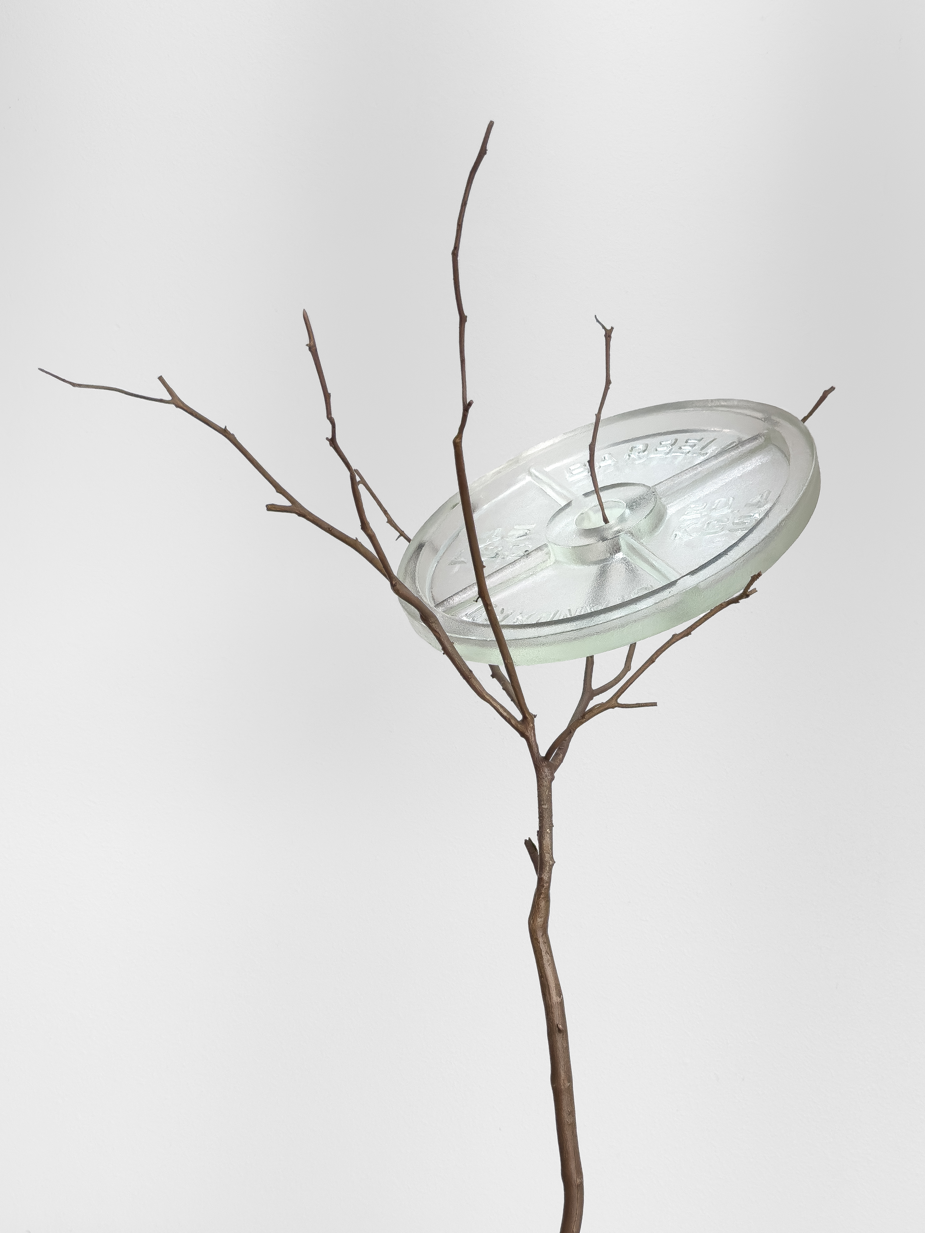 The unconventional assemblages of glass and mass-produced products such as paper and buckets introduce an unsettling balance in Babaeva’s work. The organic shaped glasses placed on the edge of a box, or clamped as non-functional medical flasks in a series called “This Time Tomorrow” create uncomfortable tensions in the viewers. And the same tension is released when the glasses are surrendered into the open, self-less water in the video called “Word of Mouth”. We can’t help but to ask, “Where is the breaking point and what is the language of non-utilitarian glasses?” Babaeva’s transformation of the materials twists our expectations of the everyday objects, pointing to the vulnerability of what we take for granted.