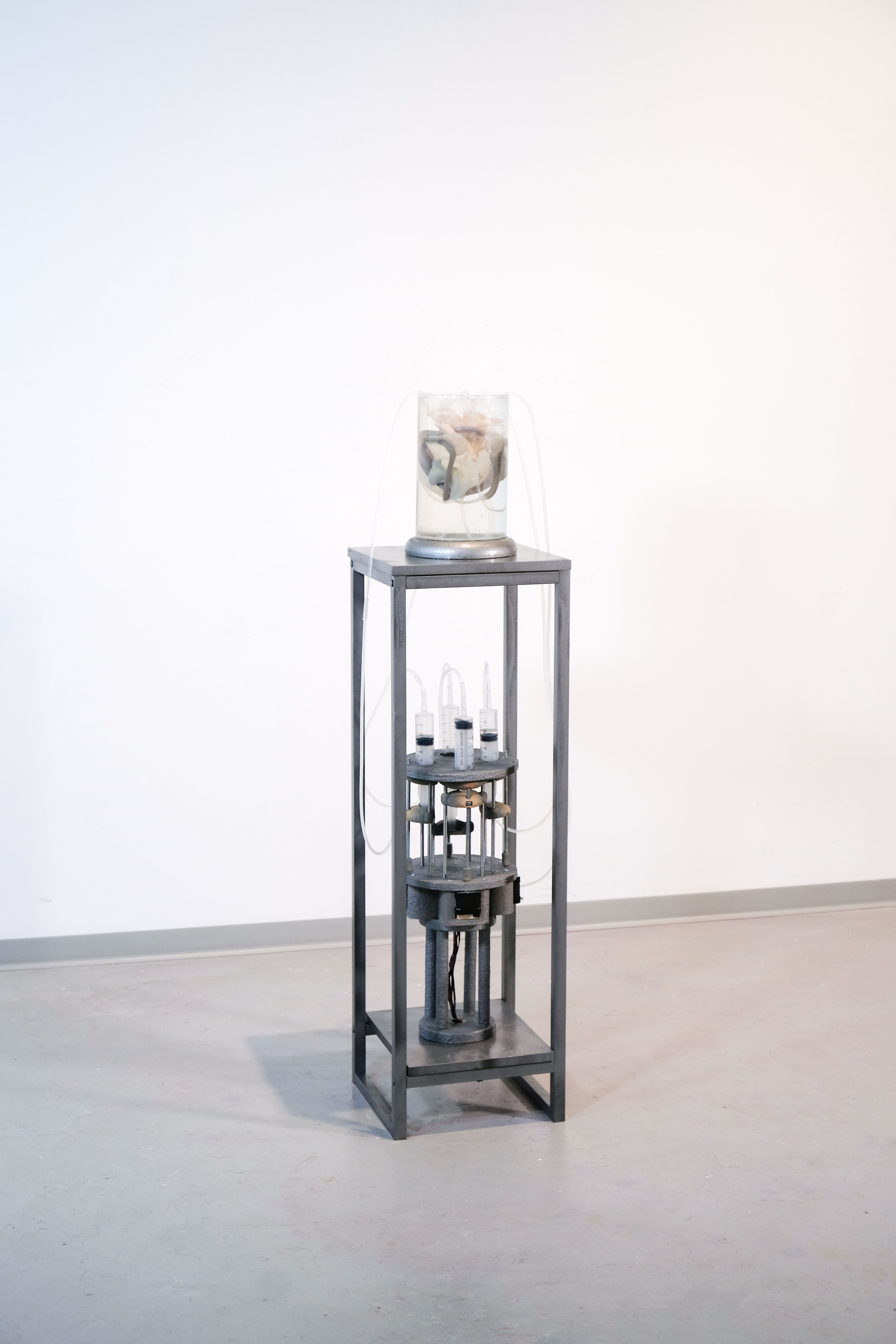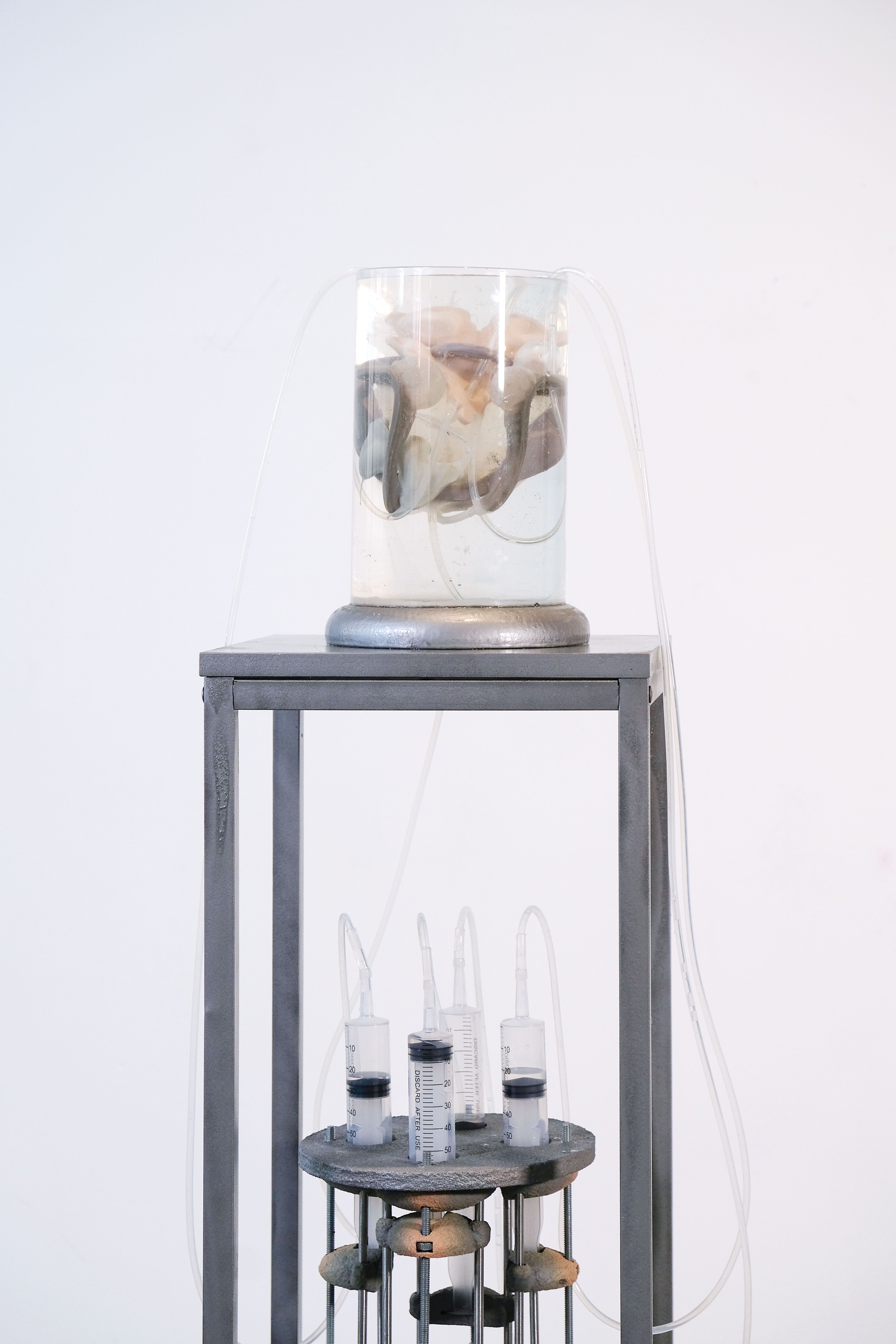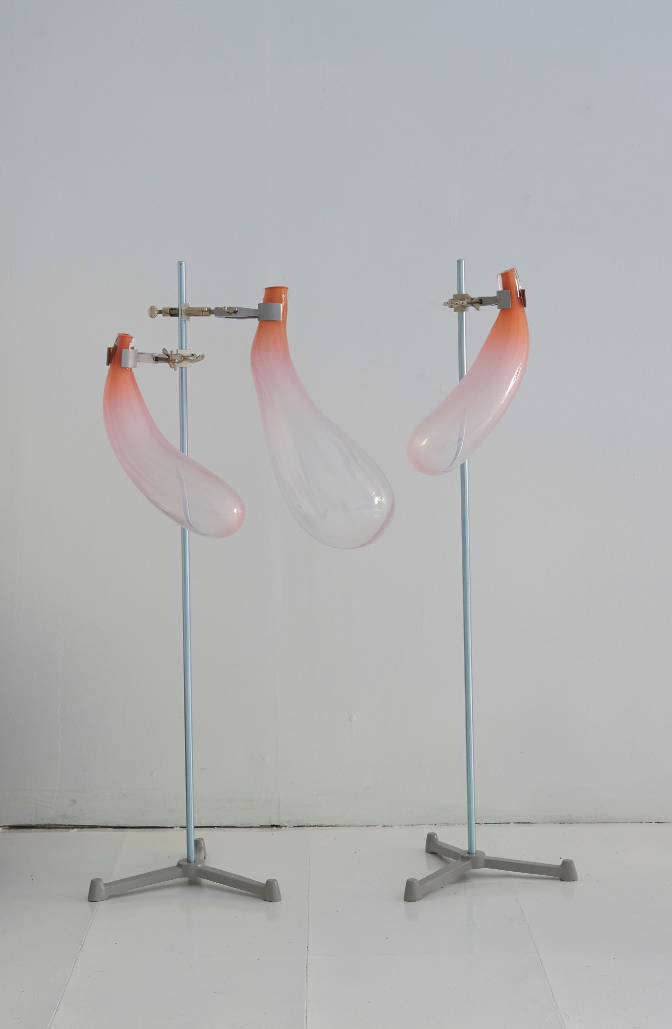 by Inna Babaeva, blown glass and chemical lab stands, 36 x 42 x 16 in, 2021