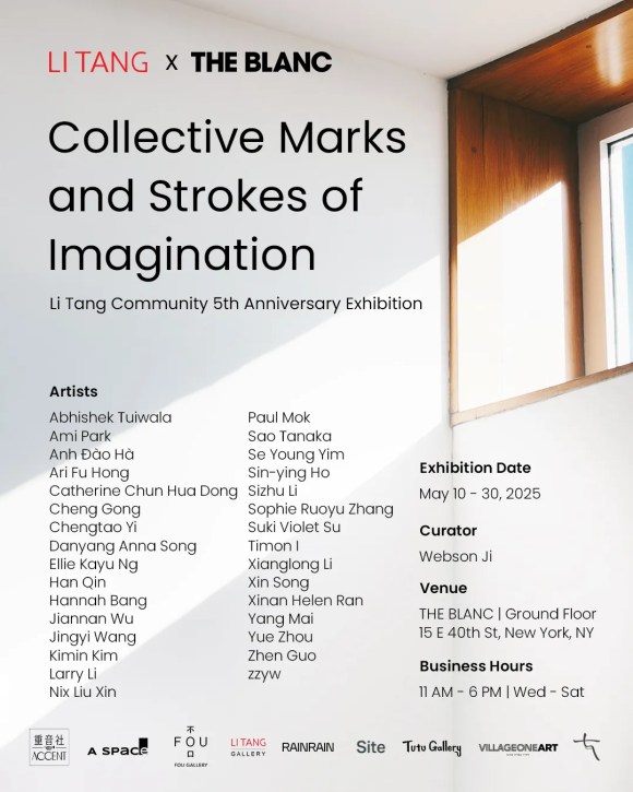 𝘊𝘰𝘭𝘭𝘦𝘤𝘵𝘪𝘷𝘦 𝘔𝘢𝘳𝘬𝘴 𝘢𝘯𝘥 𝘚𝘵𝘳𝘰𝘬𝘦𝘴 𝘰𝘧 𝘐𝘮𝘢𝘨𝘪𝘯𝘢𝘵𝘪𝘰𝘯 marks the fifth anniversary of Li Tang Community, bringing together 31 Asian diaspora artists and art groups from Los Angeles to New York. This exhibition celebrates a vibrant spectrum of practices, each work a gesture of imagination, connection, and resilience.